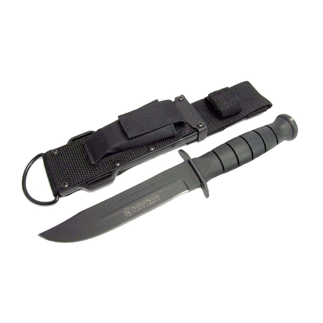 A faca Smith & Wesson Search and Rescue possui uma lâmina lisa em aço inox revestida de preto fosco. Ponta modelo clip point. A empunhadura é revestida de borracha com ranhuras para uma fixação segura. A faca acompanha uma bainha resistente em nylon. A bainha possui um compartimento com velcro para guardar um amolador que acompanha o conjunto.