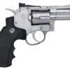 Corpo em metal niquelado com municiamento através da inserção de esferas de aço nas réplicas de cápsulas (uma esfera por cápsula).