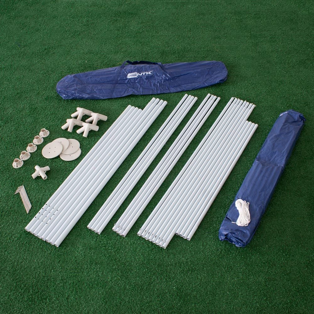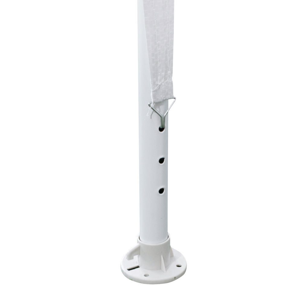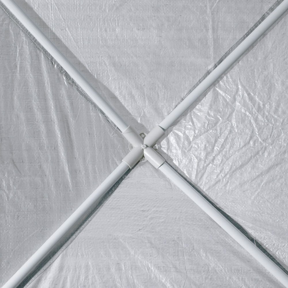 Fabricado com uma estrutura em tubos de aço com pintura esmaltada e cobertura em polietileno impermeável na cor branca, acompanha sacola para transporte, estacas, conexões, sapatas, cordinhas para fixação e exclusivo sistema de ancoragem em superfícies macias (terra/areia).